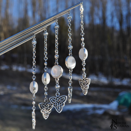 Thin metal hairstick with chain decoration, a interlaced Triquetra and a white color resin stone