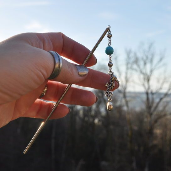 A delicate metal hair stick inspired by the world of mermaids. It is decorated with a small seahorse, a marine totem animal, and a blue howlite bead.
