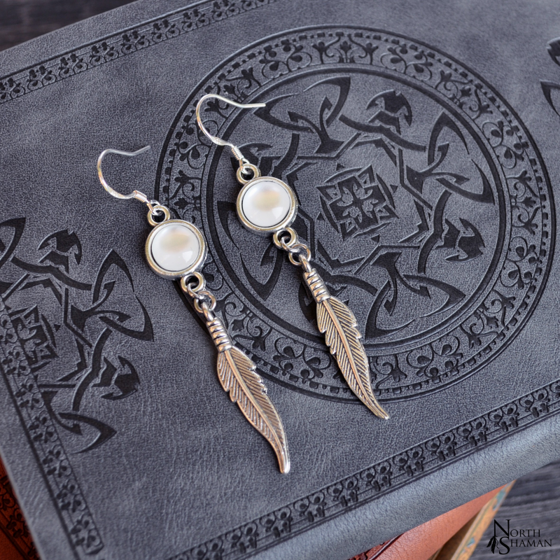 Boucles d'oreilles avec une petite plume pendante et une résine blanche nacrée