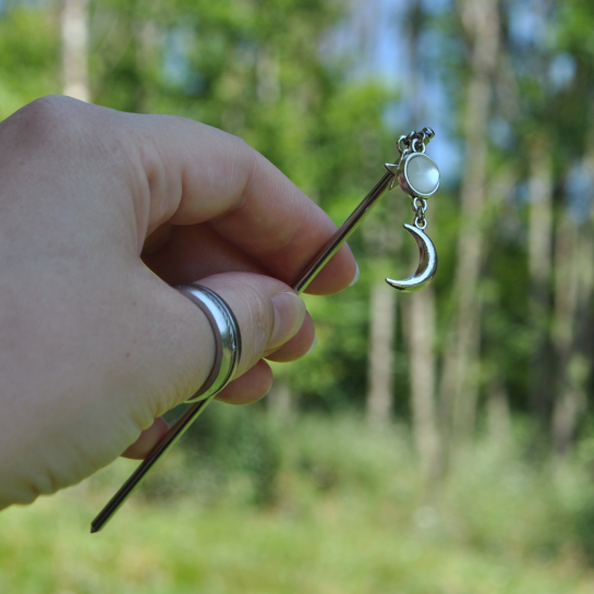 Pique à cheveux fin en métal avec une décoration d'un croissant de lune, une pierre de résine blanche et une petite étoile